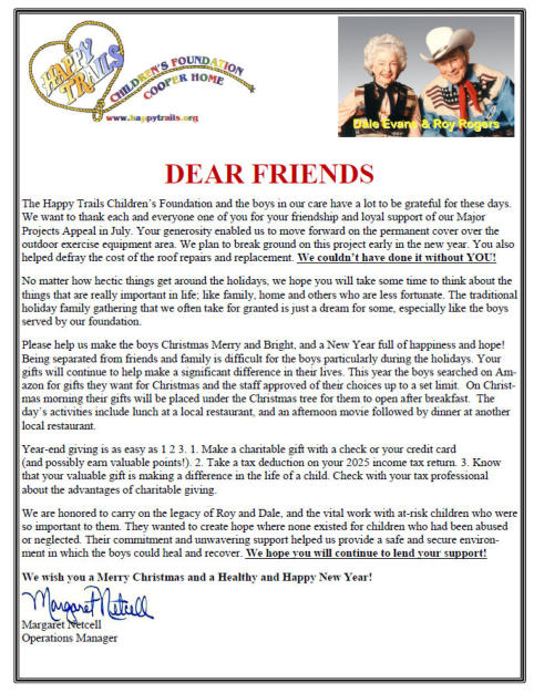 Trigger, Bullet, Roy Rogers, Dale Evans, Roy Rogers Jr., Happy Trails Children's Foundation and RogersDale U.S.A. logo are trademarks of Roy Rogers.